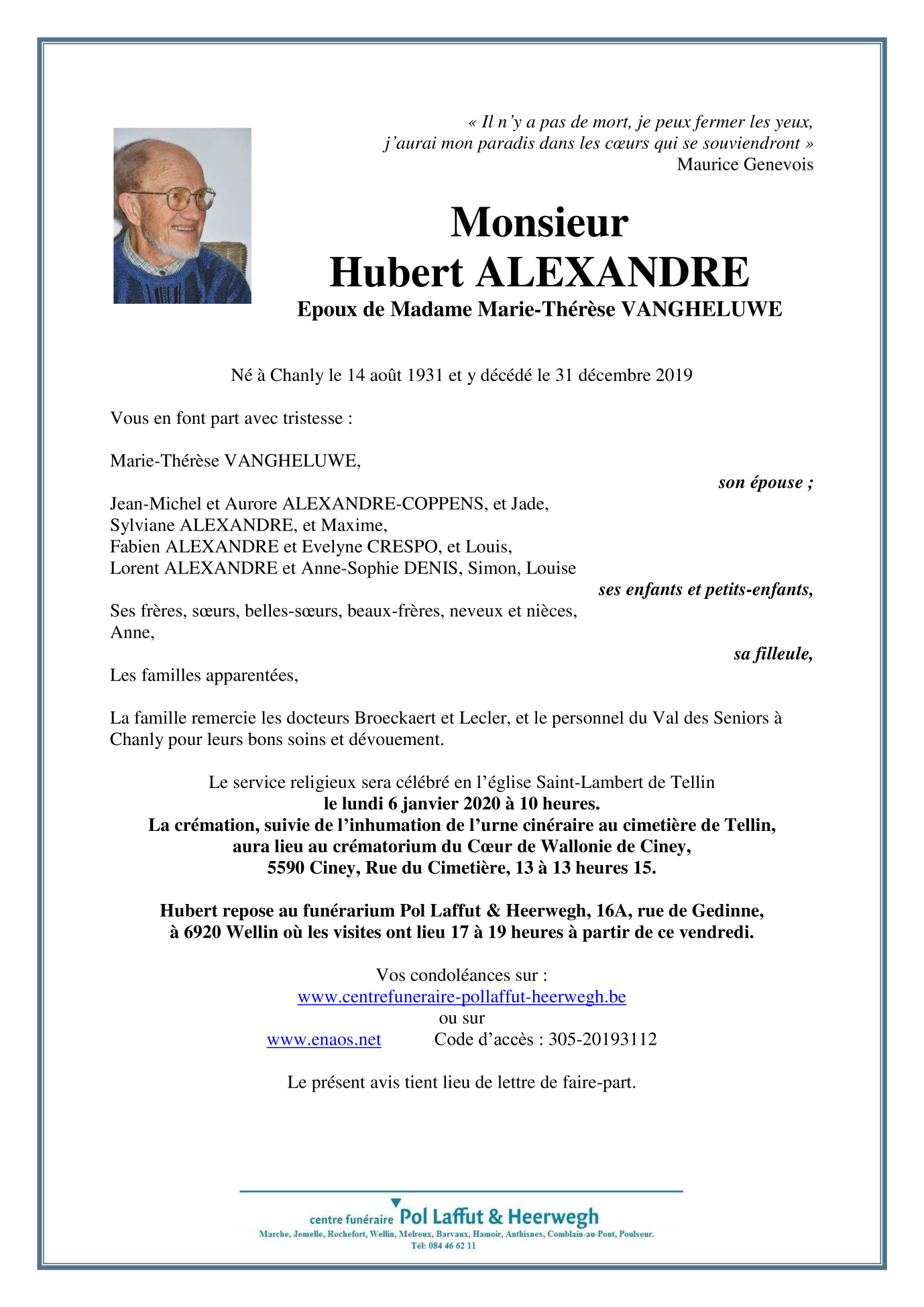 Died in Chanly (6921) on 31 December 2019 at the age of 88 years