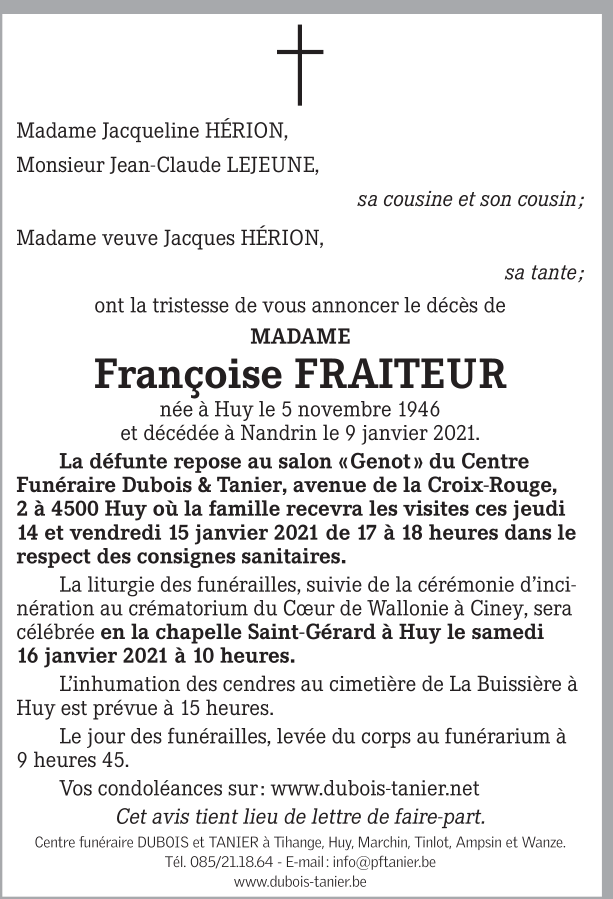 Décédée à Nandrin (4550) le samedi 9 janvier 2021 à l'âge de 74 ans
