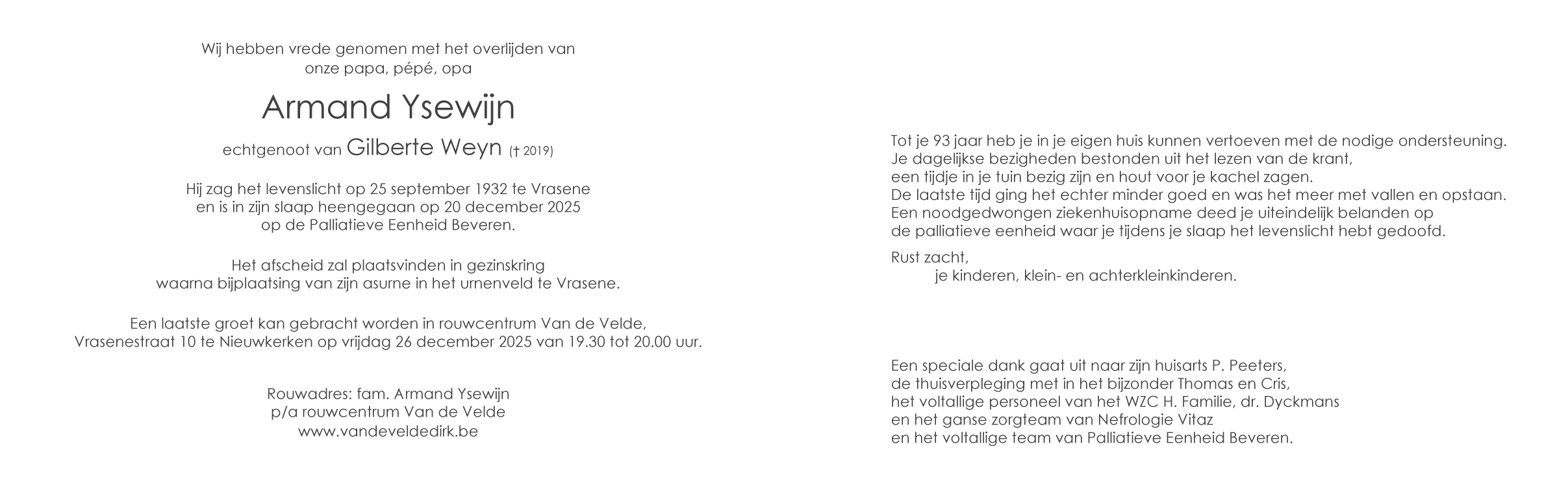 Décédé à Beveren-Waas (9120) le samedi 20 décembre 2025 à l'âge de 93 ans