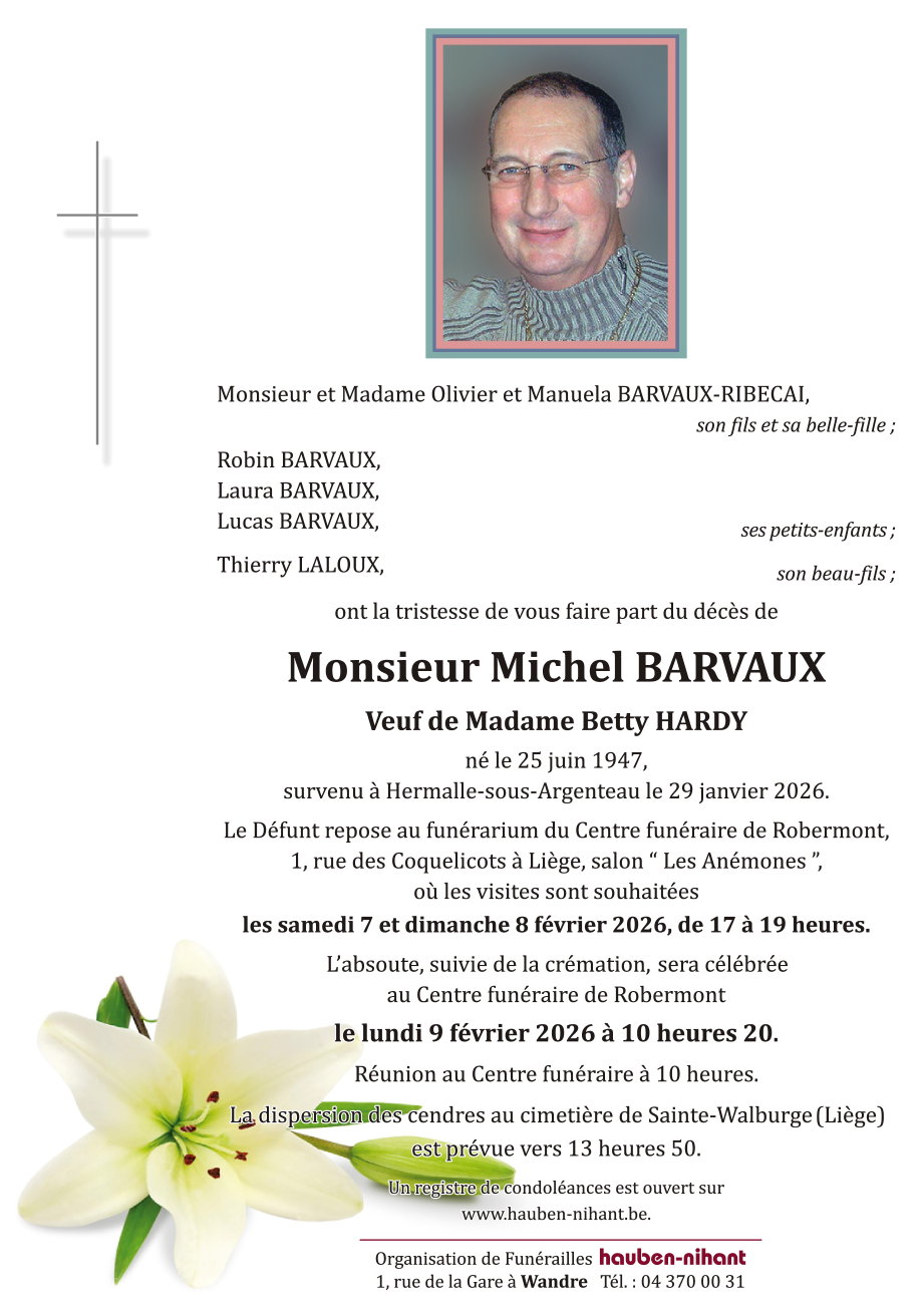 Décédé à Hermalle-sous-Argenteau (4681) le jeudi 29 janvier 2026 à l'âge de 78 ans