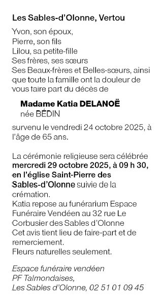 Décédée à Les Sables d'Olonne (85100, France) le vendredi 24 octobre 2025 à l'âge de 65 ans