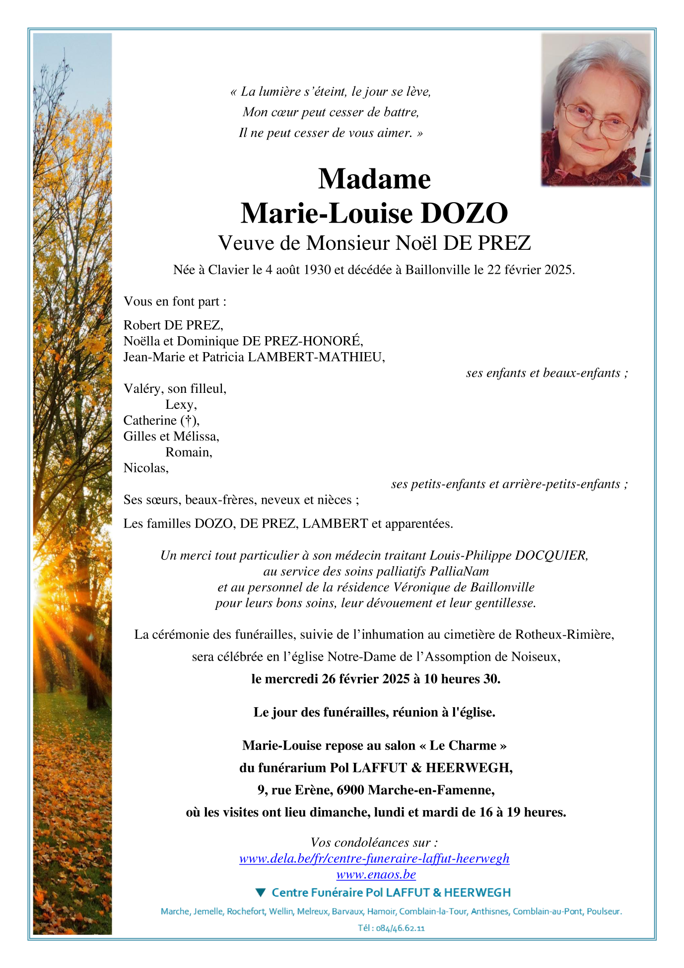 Décédée à Baillonville (5377) le samedi 22 février 2025 à l'âge de 94 ans
