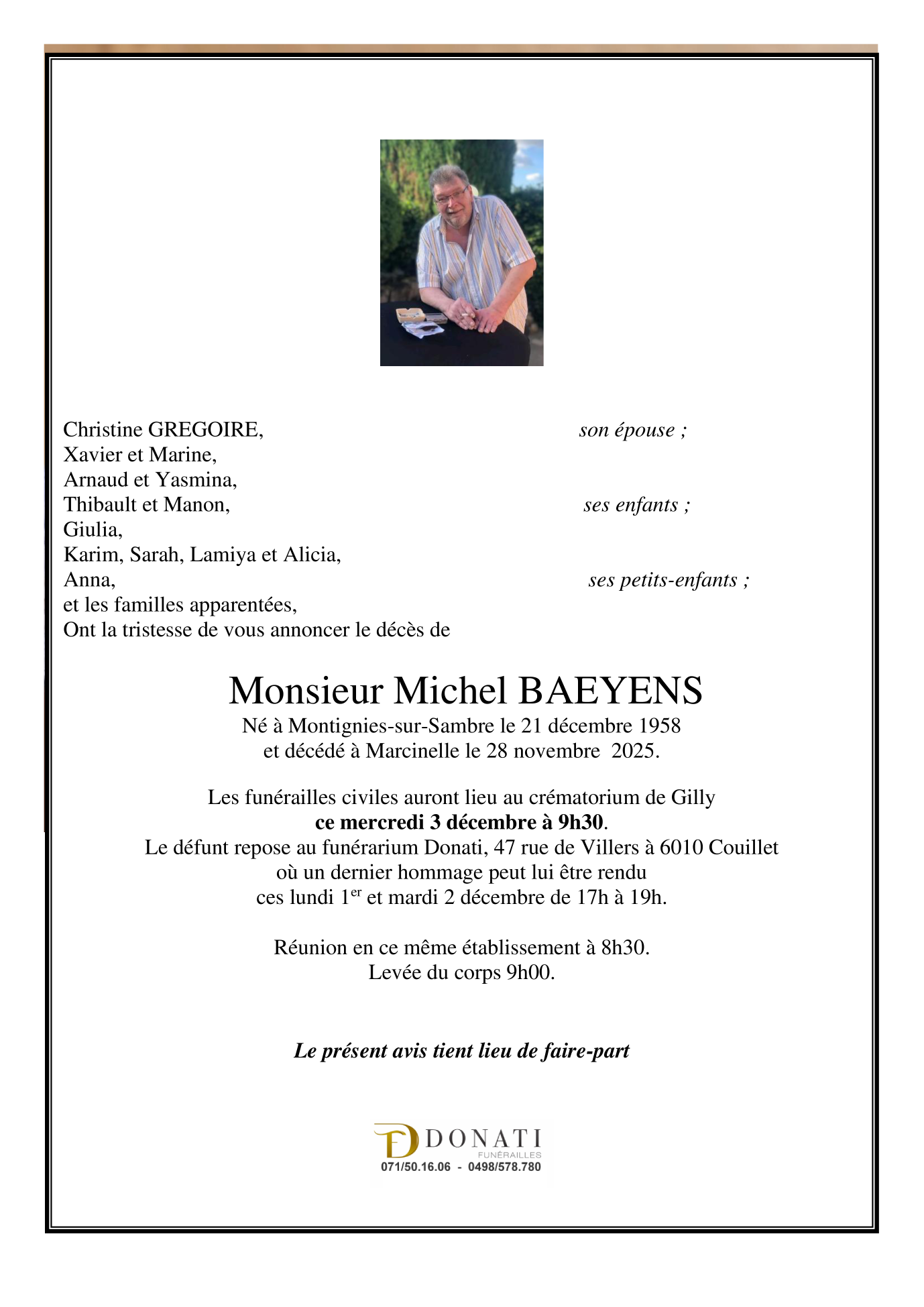 Décédé à Marcinelle (6001) le vendredi 28 novembre 2025 à l'âge de 66 ans