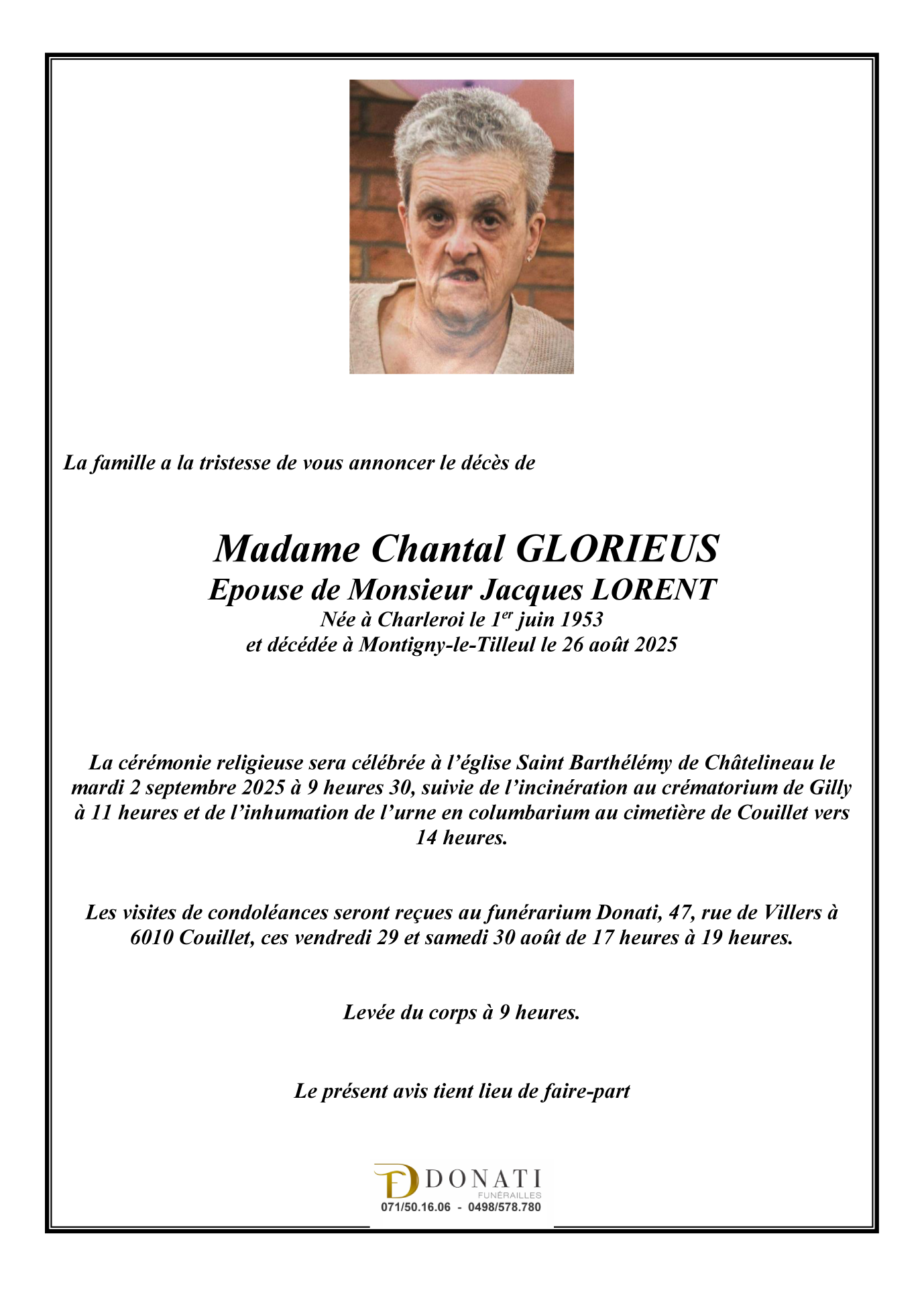 Décédée à Montigny-le-Tilleul (6110) le mardi 26 août 2025 à l'âge de 72 ans