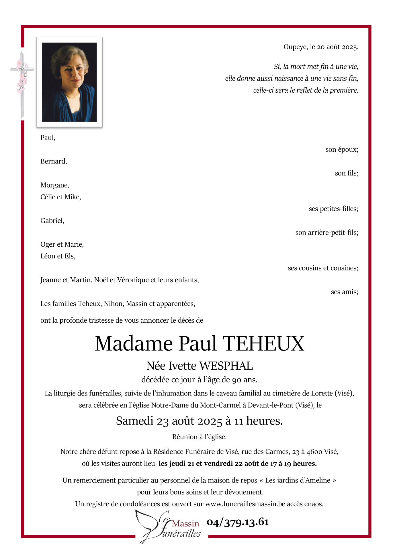 Died in Oupeye (4680) on 20 August 2025 at the age of 90 years