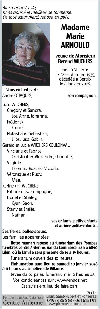 Décédée à Bertrix (6880) le mardi 6 janvier 2026 à l'âge de 90 ans