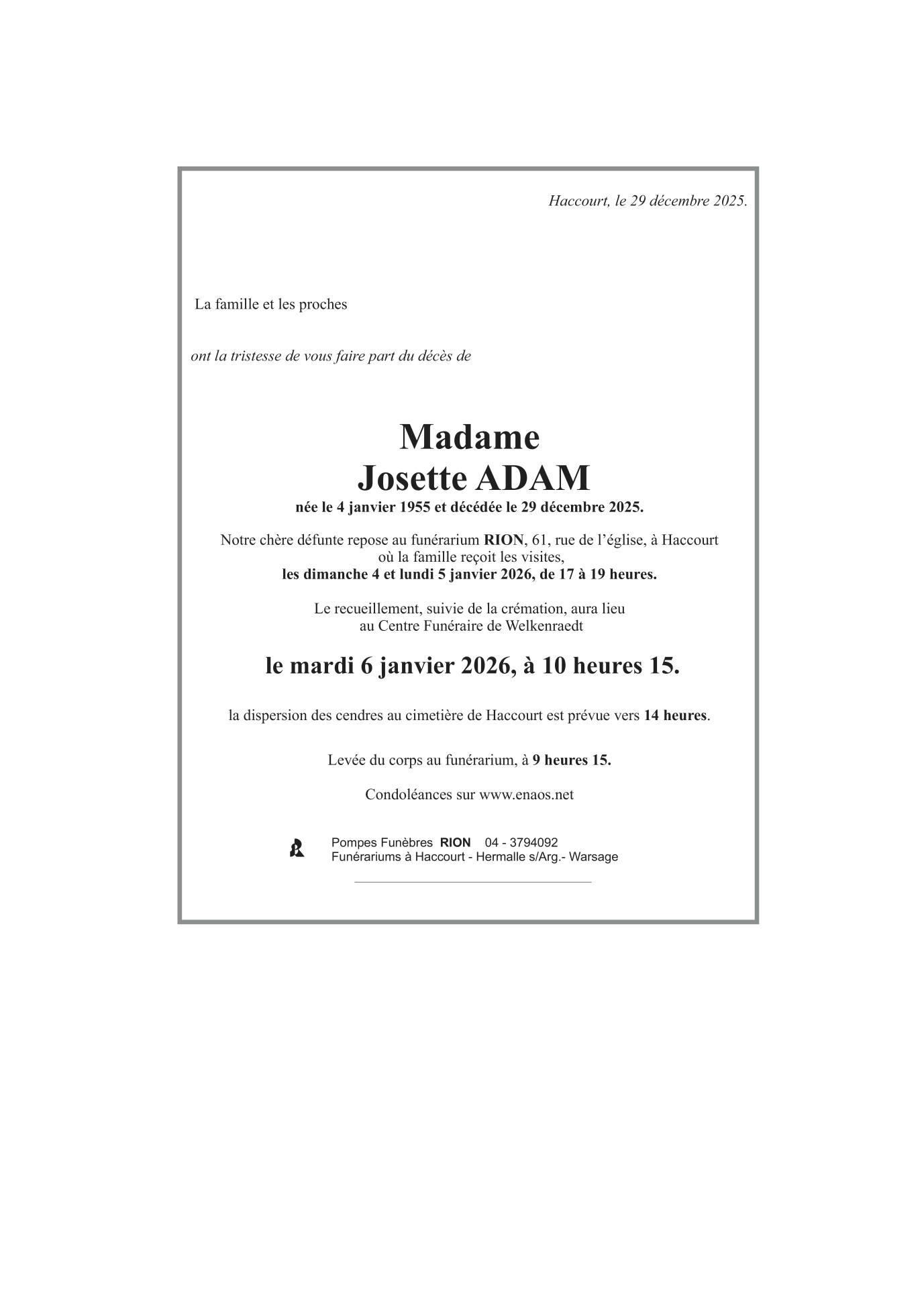 Décédée à Blegny (4670) le lundi 29 décembre 2025 à l'âge de 70 ans