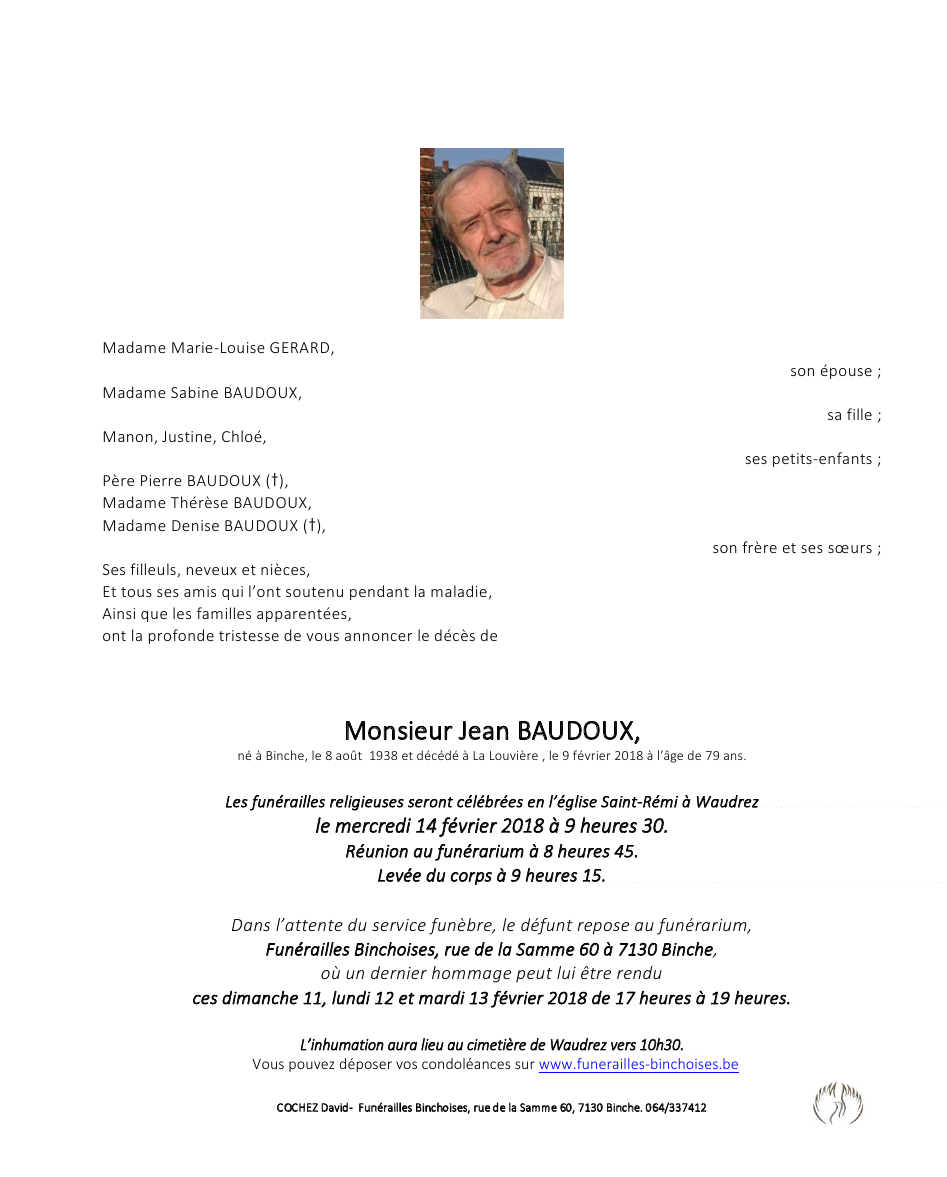 Décédé à Haine-Saint-Paul (7100) le vendredi 9 février 2018 à l'âge de 79 ans