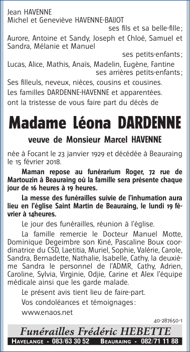 Décédée à Beauraing (5570) le jeudi 15 février 2018 à l'âge de 89 ans