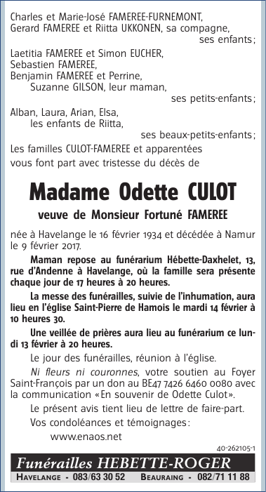 Décédée à Namur (5000) le jeudi 9 février 2017 à l'âge de 82 ans