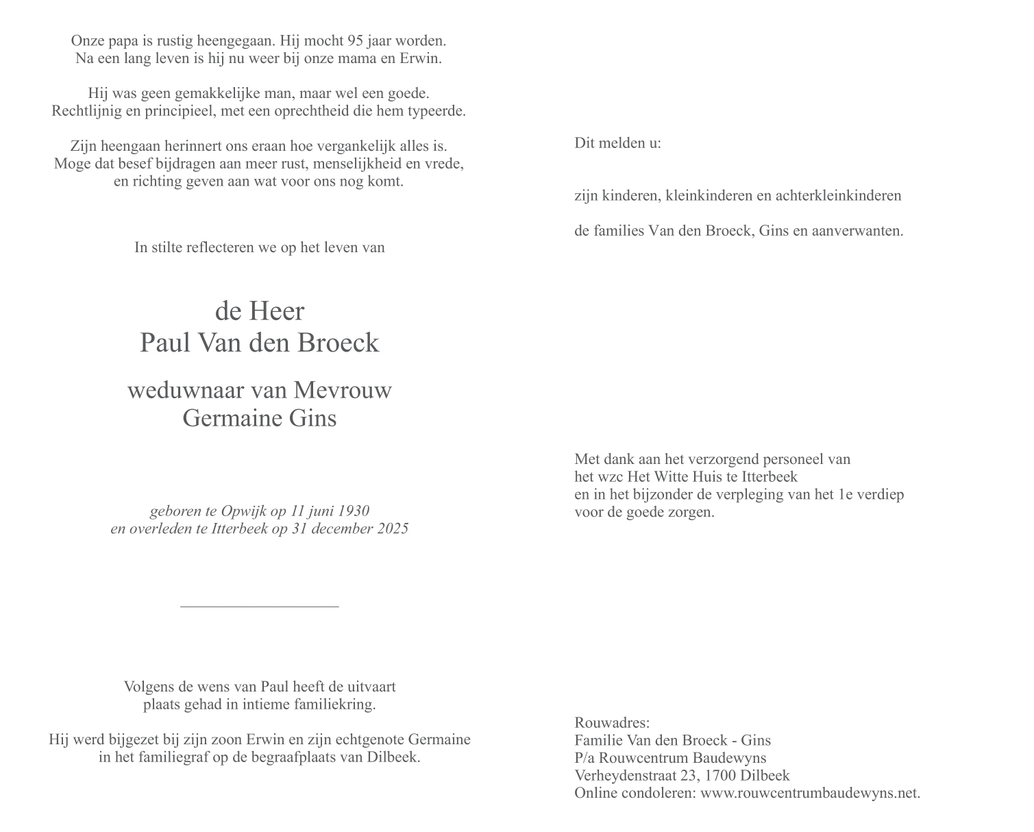 Décédé à Itterbeek (1701) le mercredi 31 décembre 2025 à l'âge de 95 ans