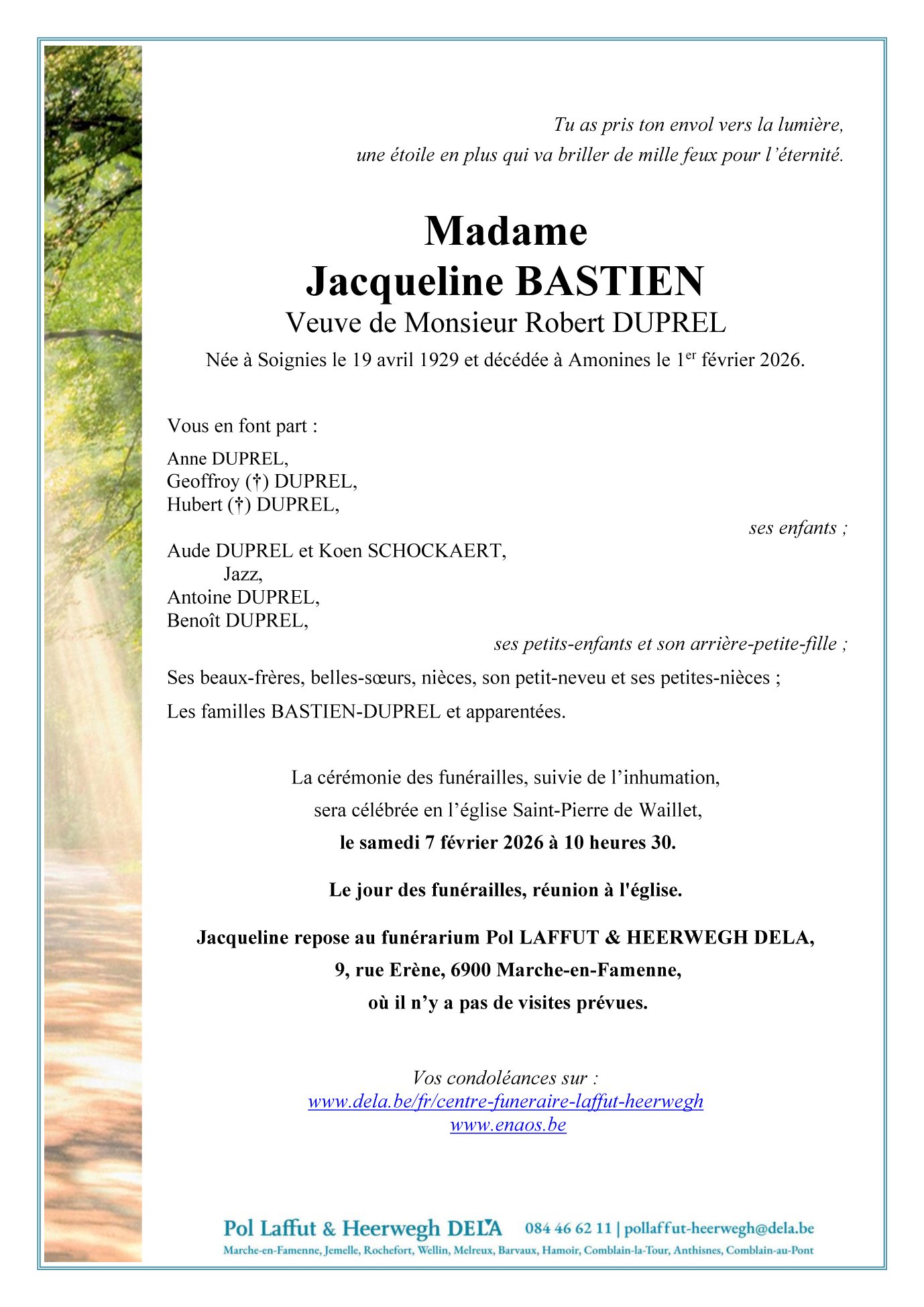 Décédée à Amonines (6997) le dimanche 1 février 2026 à l'âge de 96 ans