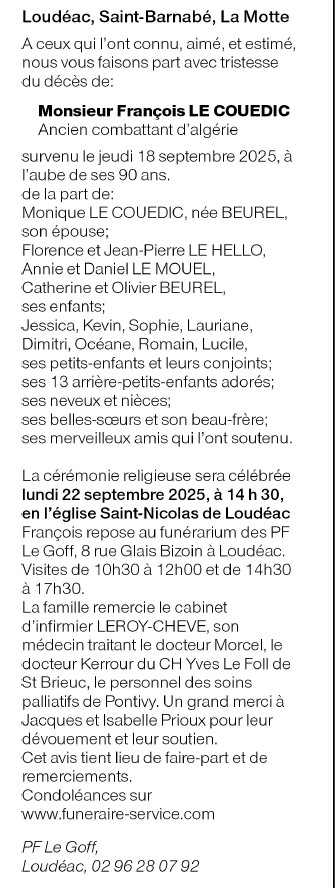 Décédé à Noyal-Pontivy (56920, France) le jeudi 18 septembre 2025 à l'âge de 89 ans