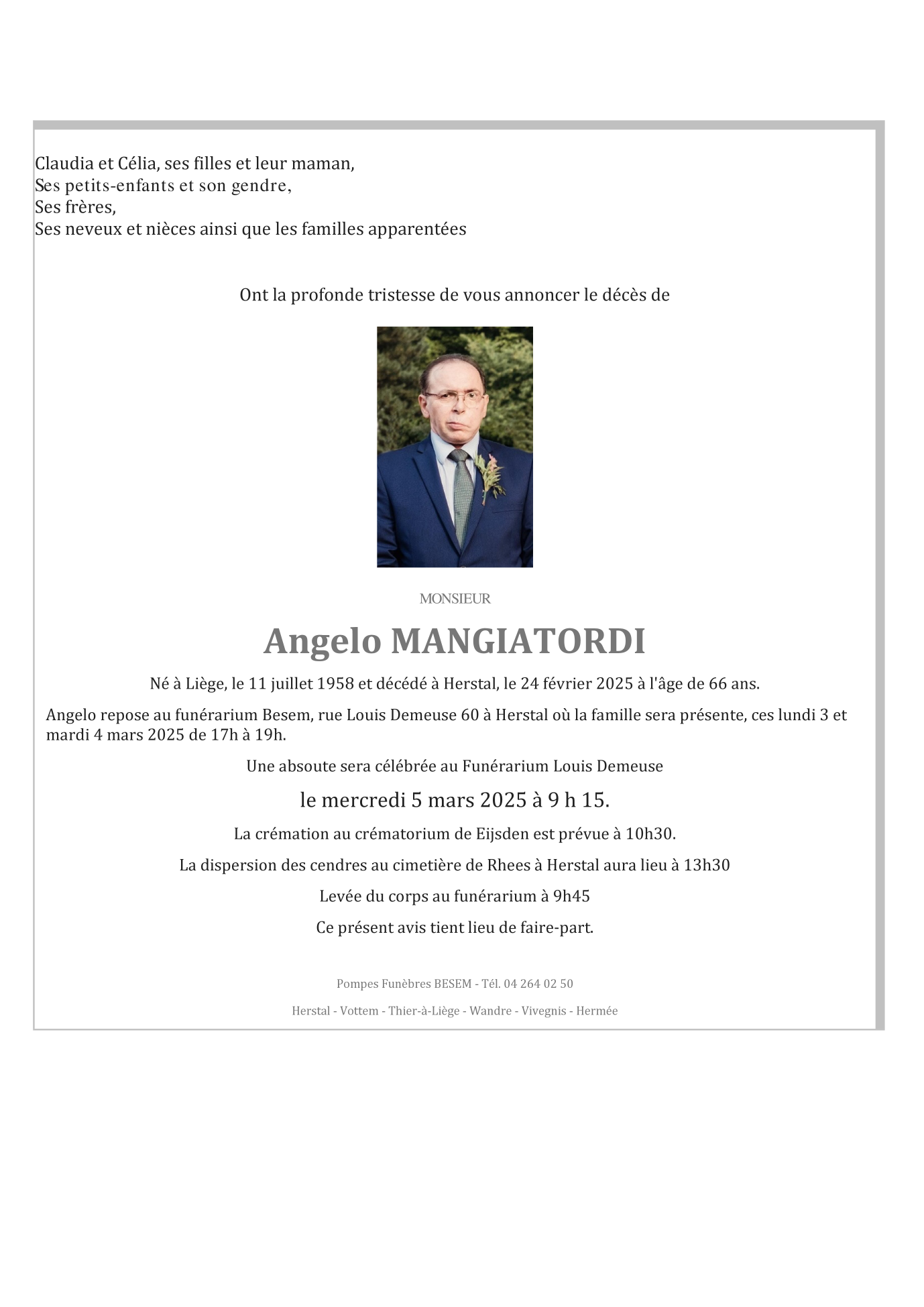 Overleden te Herstal (4040) op maandag 24 februari 2025 op 66-jarige leeftijd
