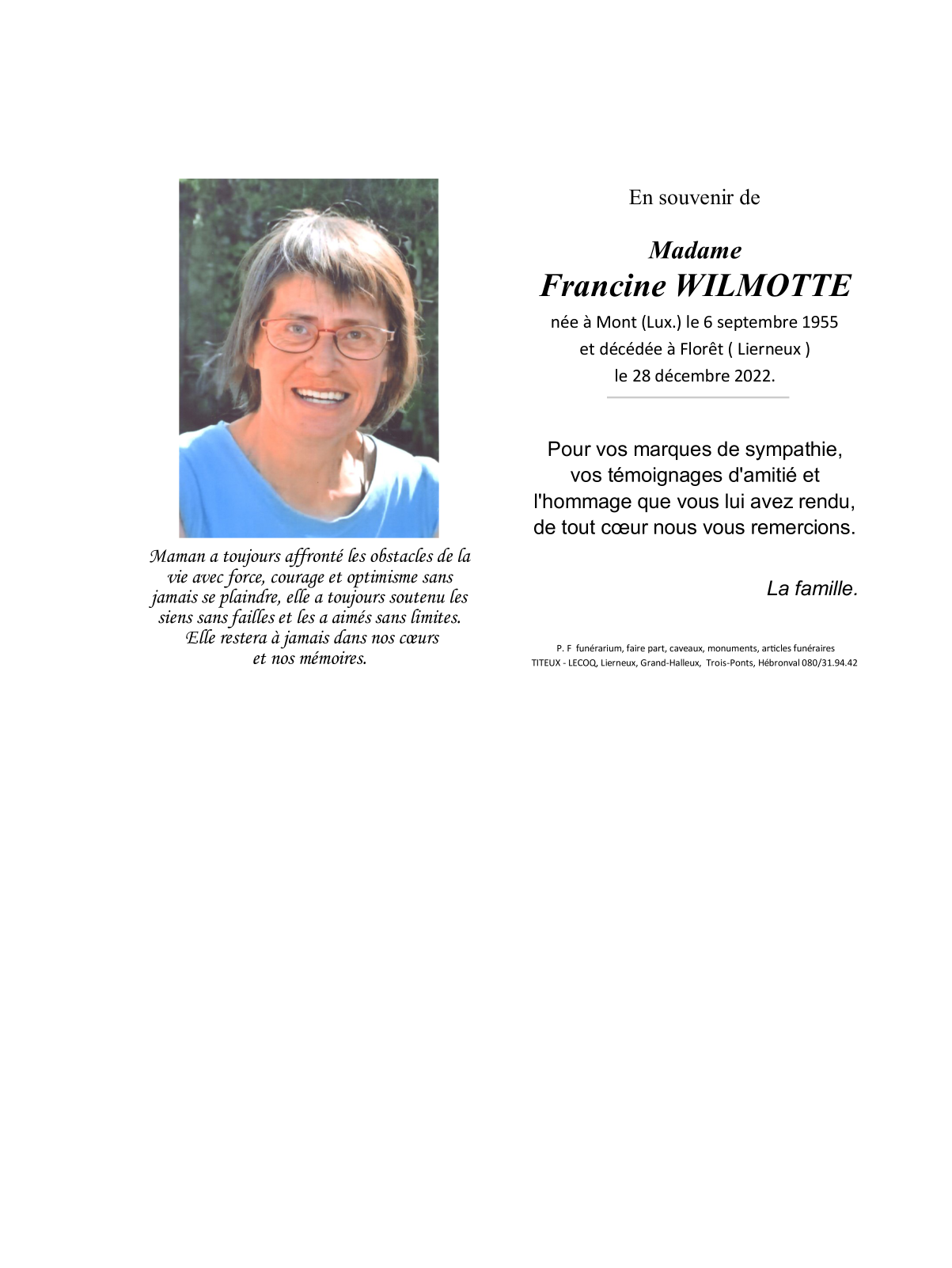 Fallecida en Florêt (4990) el miércoles, 28 de diciembre de 2022 a la edad de 67 años