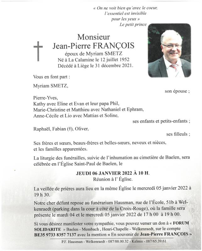 Décédé à Liège (4000) le vendredi 31 décembre 2021 à l'âge de 69 ans
