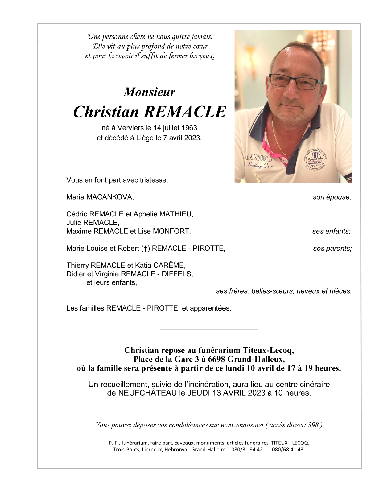 Décédé à Liège (4000) le vendredi 7 avril 2023 à l'âge de 59 ans