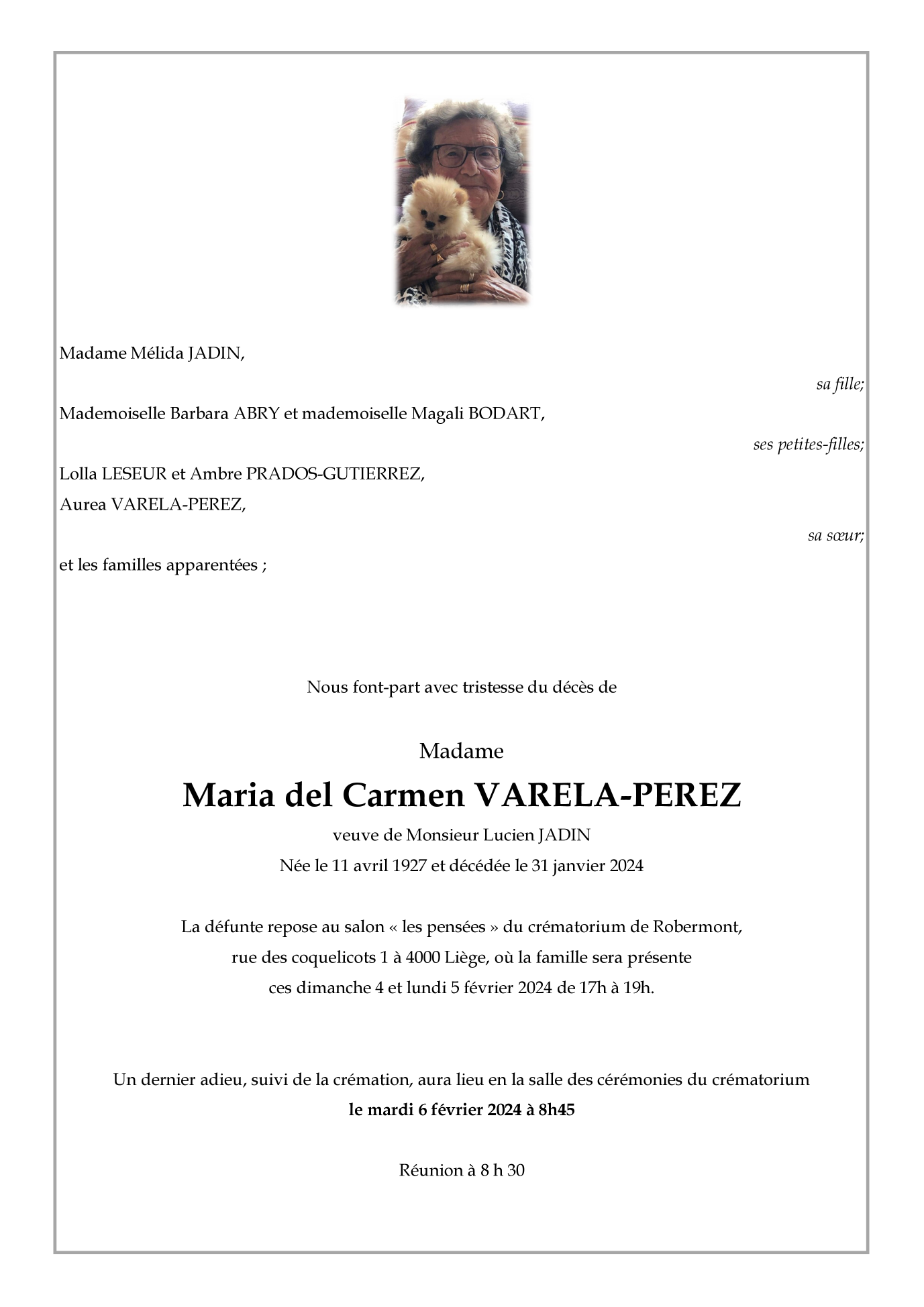 Fallecida en Chênée (4032) el miércoles, 31 de enero de 2024 a la edad de 96 años
