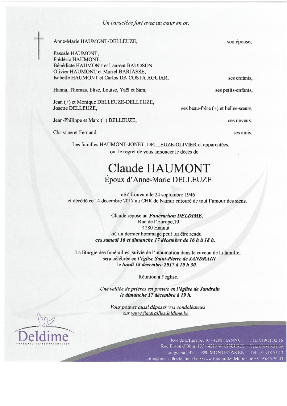Died in Namur (5000) on 14 December 2017 at the age of 71 years