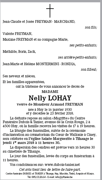 Overleden te Huy (4500) op vrijdag 23 februari 2018 op 88-jarige leeftijd