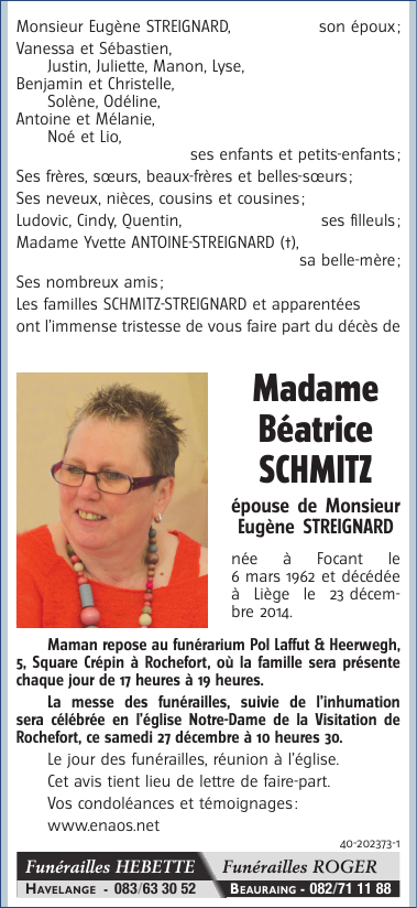 Décédée à Liège (4000) le mardi 23 décembre 2014 à l'âge de 52 ans