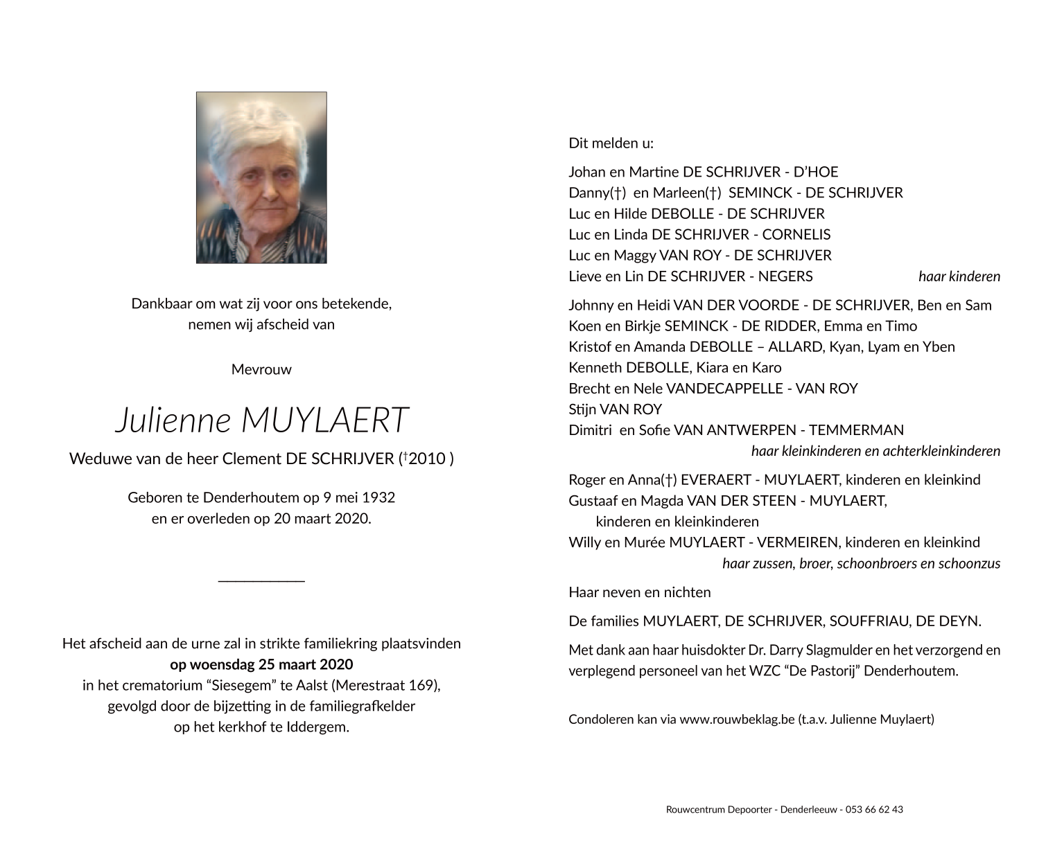 Décédé à Denderhoutem (9450) le vendredi 20 mars 2020 à l'âge de 87 ans