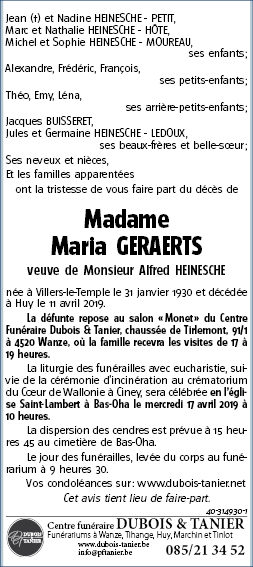 Décédée à Huy (4500) le jeudi 11 avril 2019 à l'âge de 89 ans