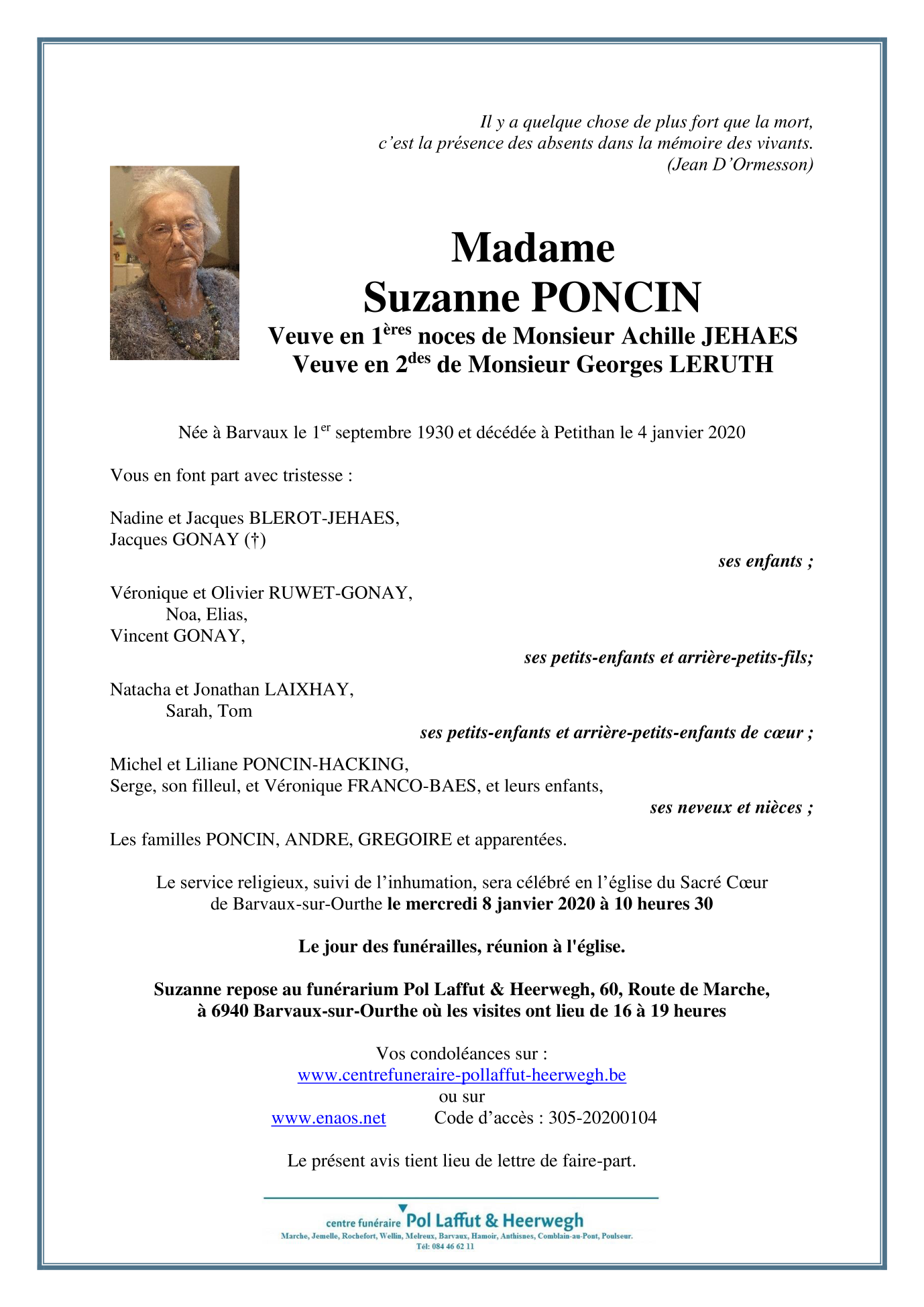 Décédée à Petit-Han (6940) le samedi 4 janvier 2020 à l'âge de 89 ans