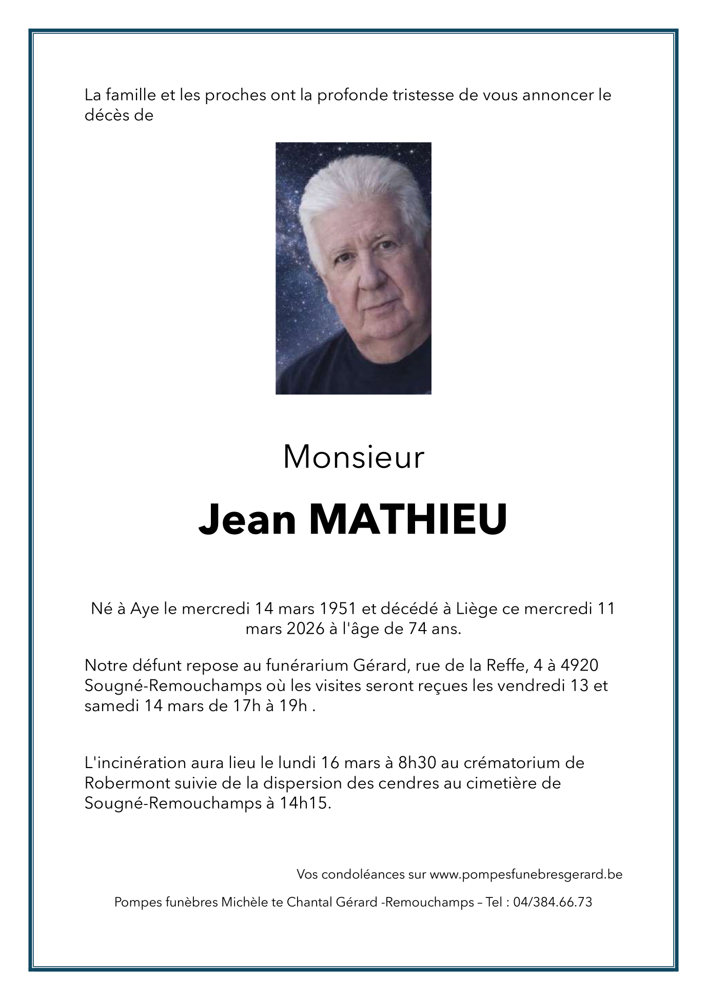 Décédé à Liège (4000) le mercredi 11 mars 2026 à l'âge de 74 ans