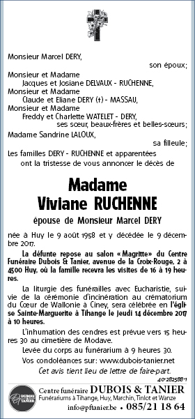 Décédée à Huy (4500) le samedi 9 décembre 2017 à l'âge de 59 ans