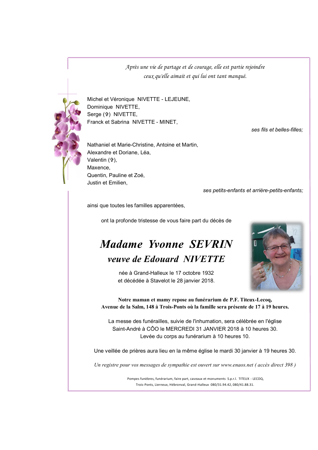 Décédée à Stavelot (4970) le dimanche 28 janvier 2018 à l'âge de 85 ans
