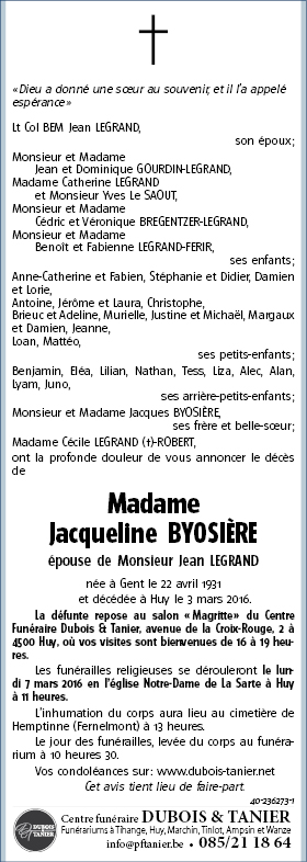 Décédée à Huy (4500) le jeudi 3 mars 2016 à l'âge de 84 ans