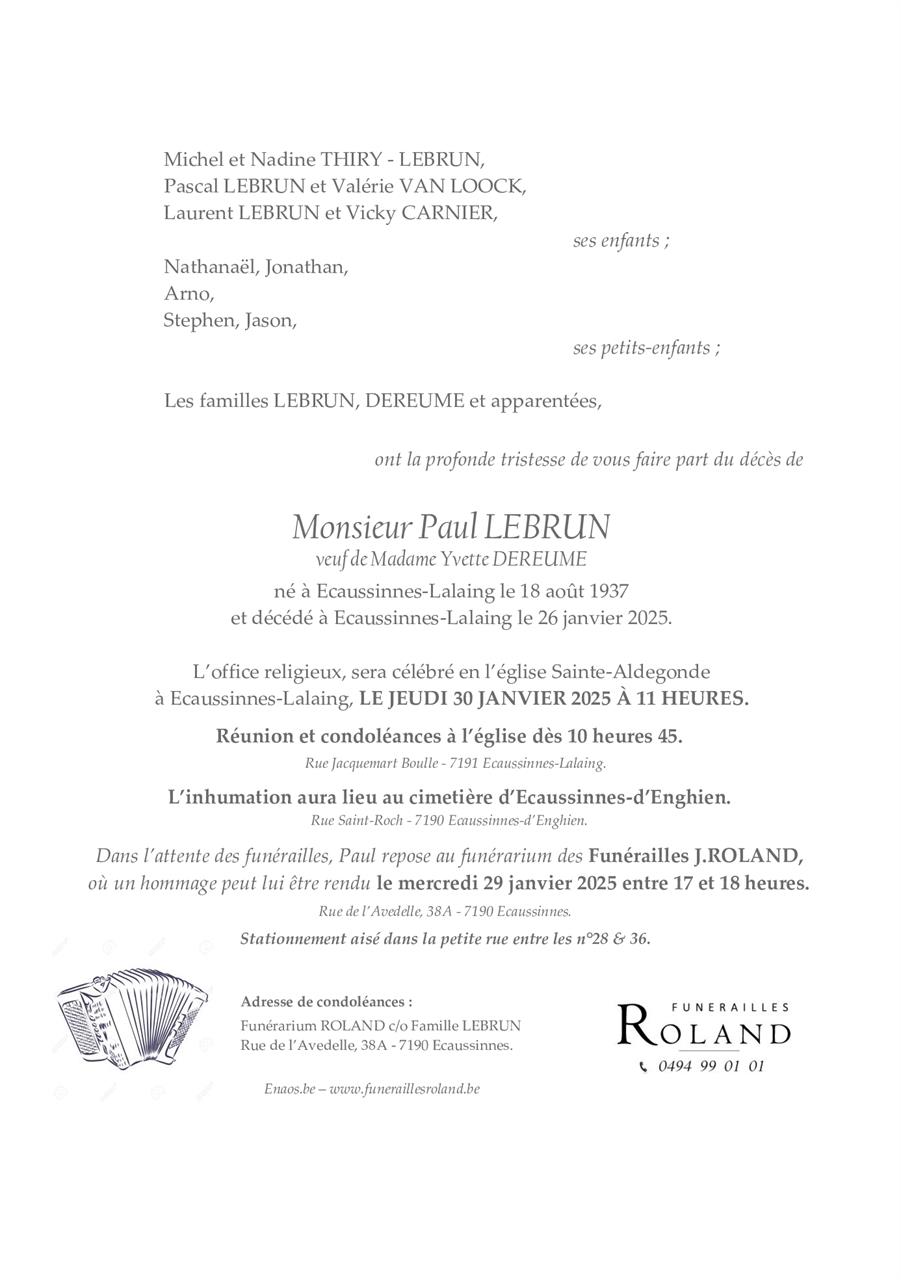 Décédé à Ecaussinnes-Lalaing (7191) le dimanche 26 janvier 2025 à l'âge de 87 ans