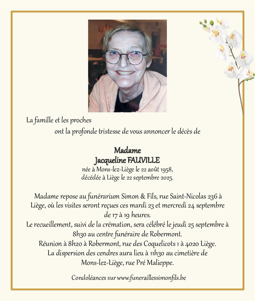 Fallecida en Liège (4020) el lunes, 22 de septiembre de 2025 a la edad de 67 años
