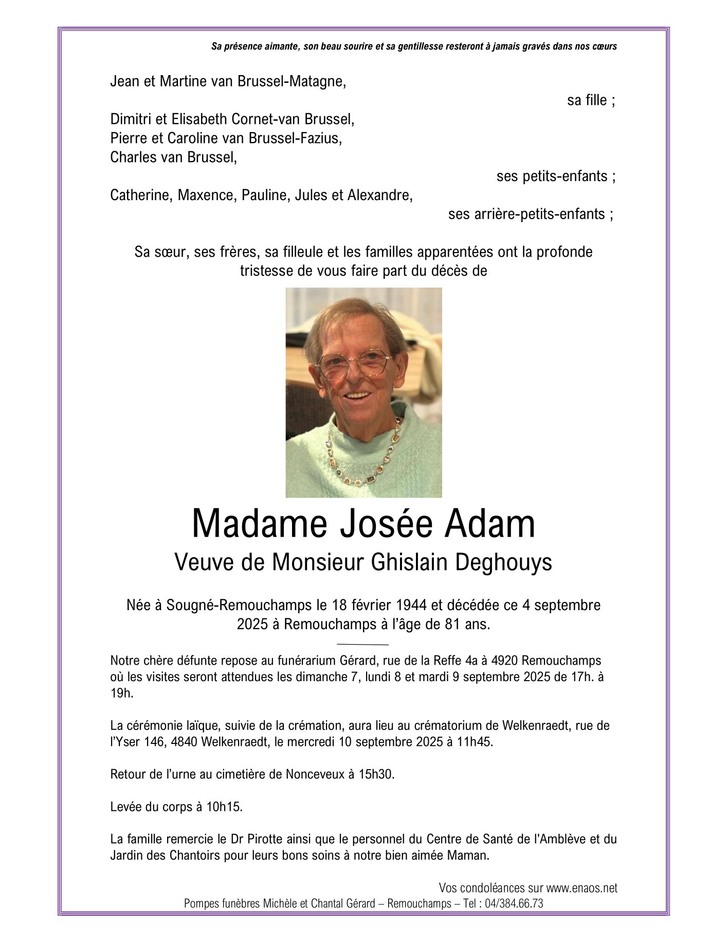 Décédée à Aywaille (4920) le jeudi 4 septembre 2025 à l'âge de 81 ans