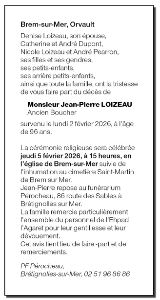 Fallecido en Brem-sur-Mer (85470, Francia) el lunes, 2 de febrero de 2026 a la edad de 96 años