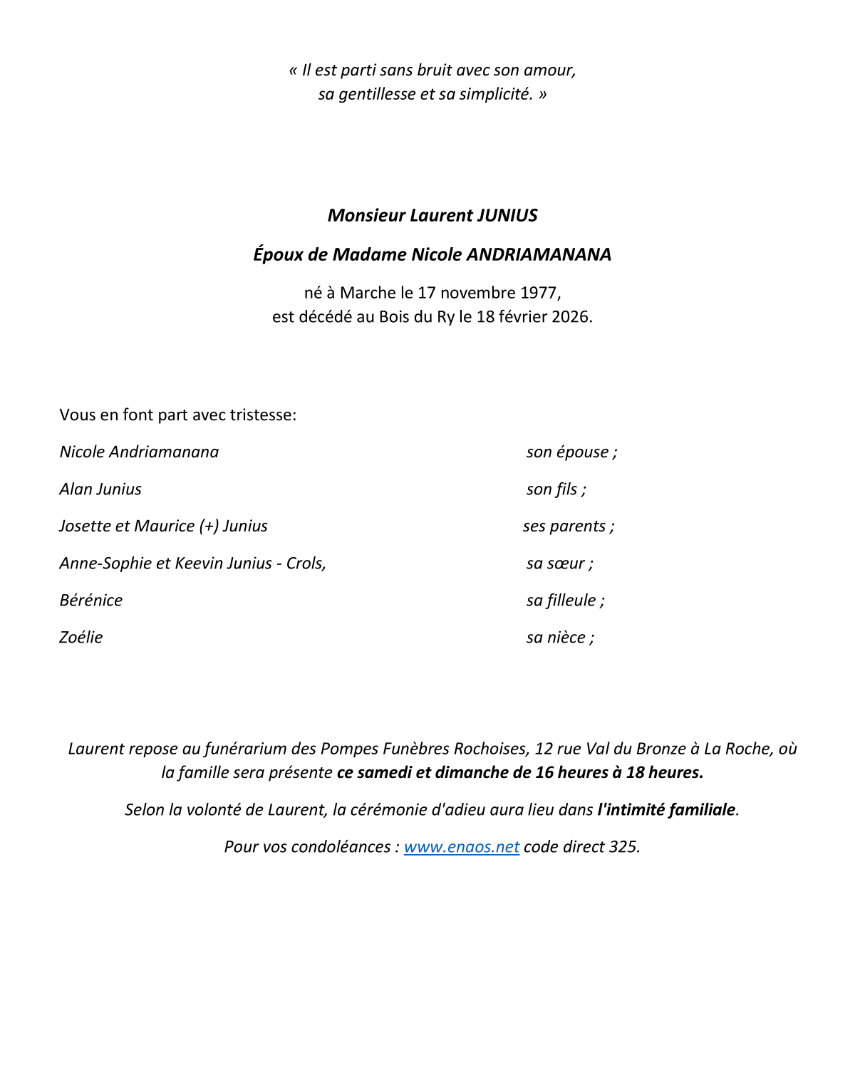 Décédé à Bois du Ry (6987) le mercredi 18 février 2026 à l'âge de 48 ans