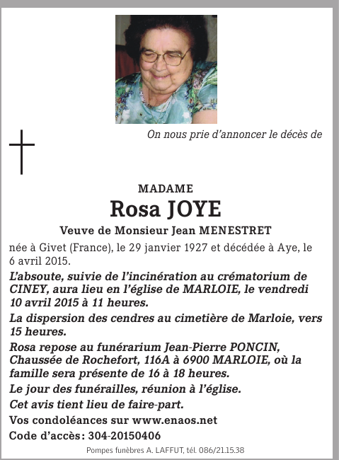 Décédé à Aye (6900) le lundi 6 avril 2015 à l'âge de 88 ans