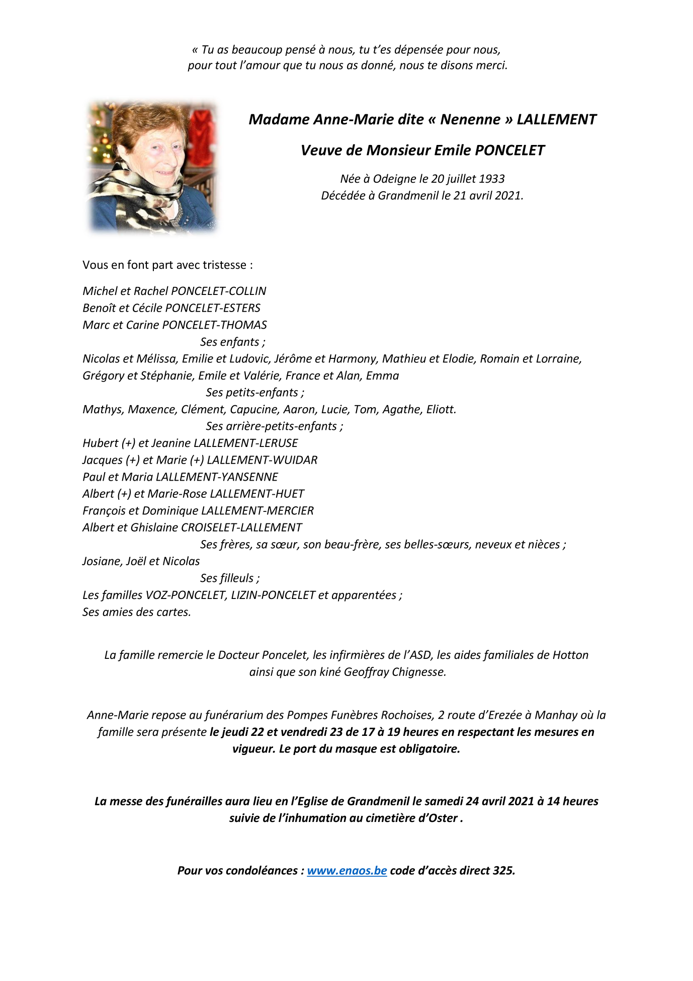 Madame Anne-Marie PONCELET née Lallement