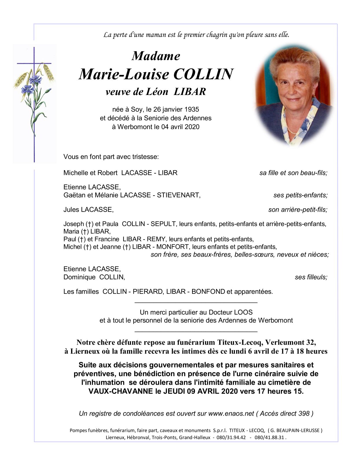 Died in Werbomont (4190) on 04 April 2020 at the age of 85 years