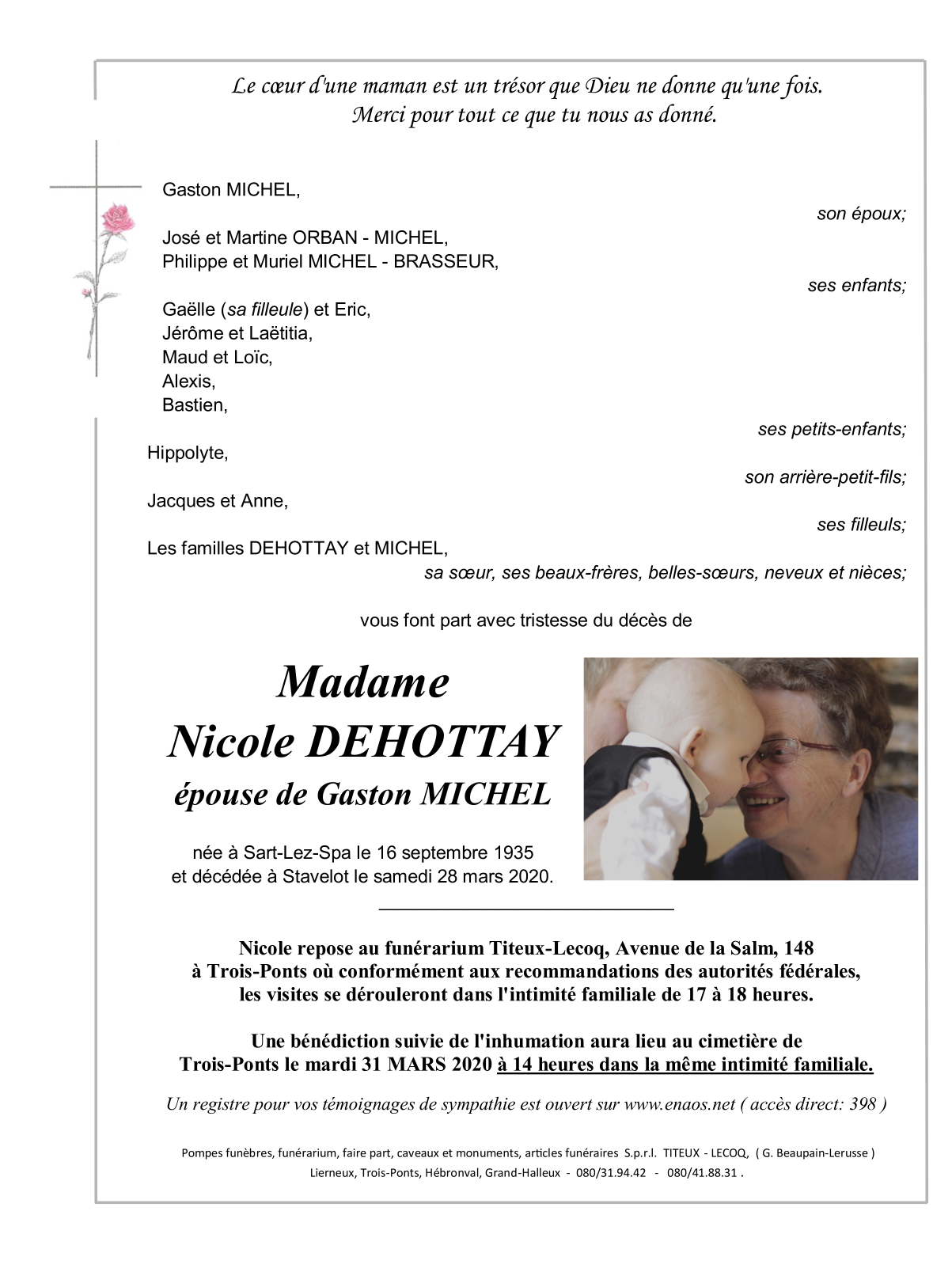 Fallecida en Stavelot (4970) el sábado, 28 de marzo de 2020 a la edad de 84 años