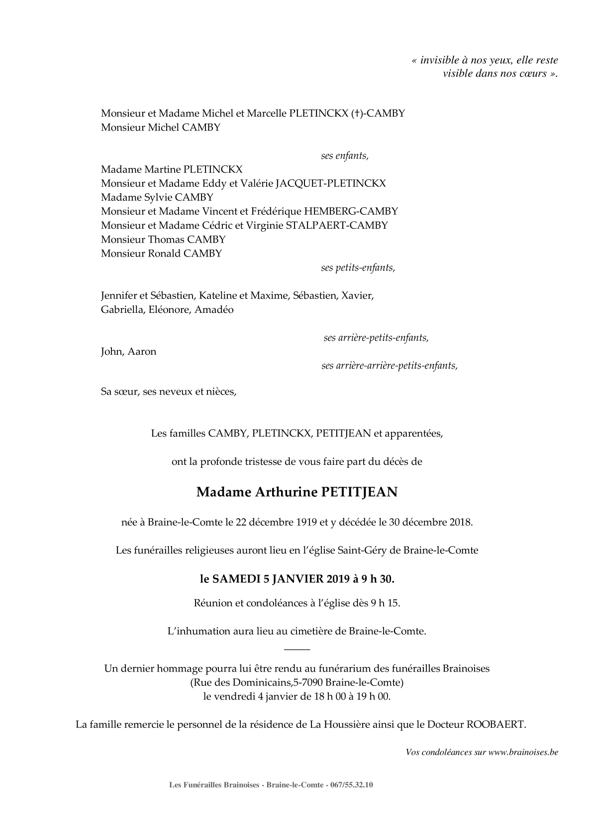 Décédée à Braine-le-Comte (7090) le dimanche 30 décembre 2018 à l'âge de 99 ans