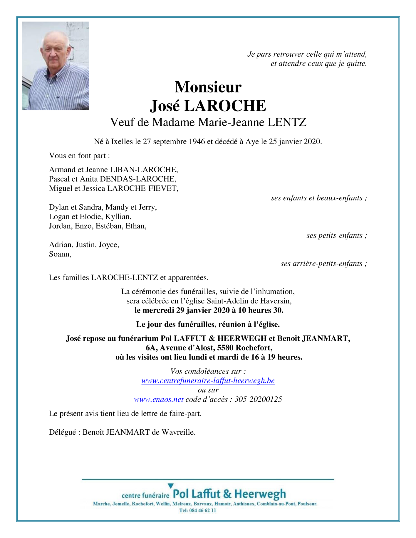 Overleden te Aye (6900) op zaterdag 25 januari 2020 op 73-jarige leeftijd