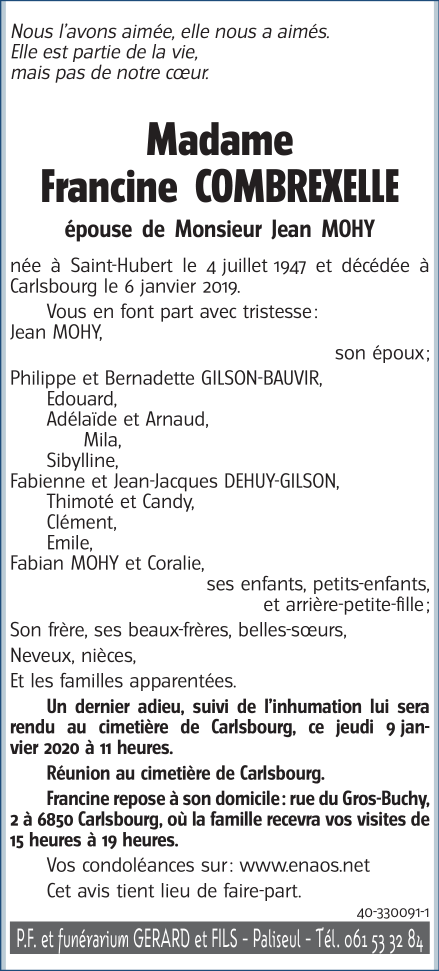 Décédée à Carlsbourg (6850) le lundi 6 janvier 2020 à l'âge de 72 ans