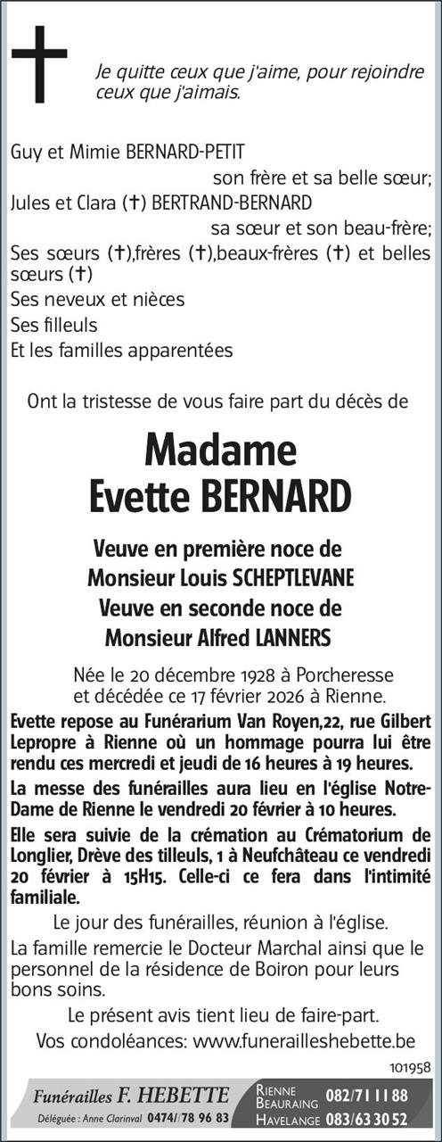Died in Rienne (5575) on 17 February 2026 at the age of 97 years