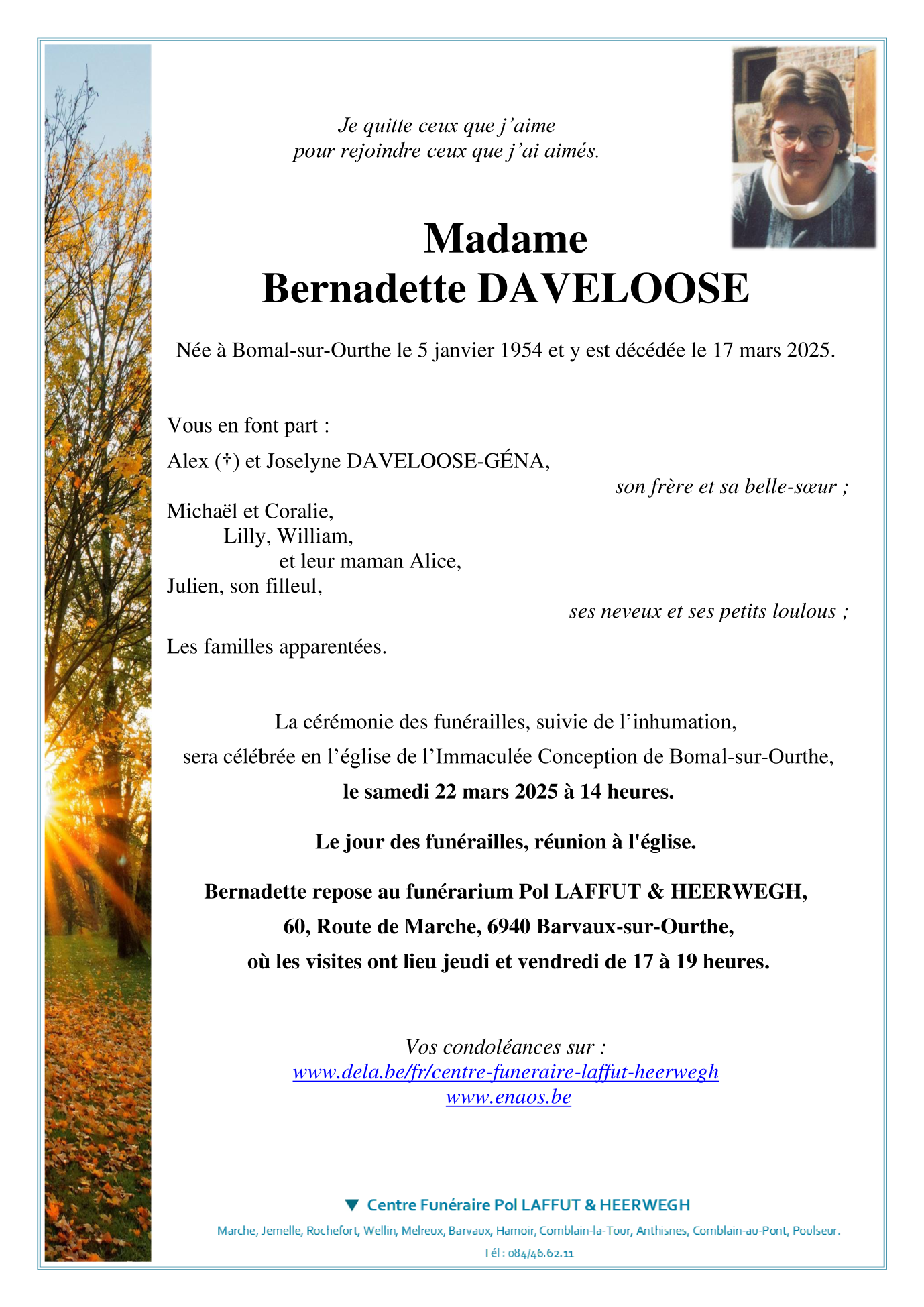 Décédée à Bomal-sur-Ourthe (6941) le lundi 17 mars 2025 à l'âge de 71 ans