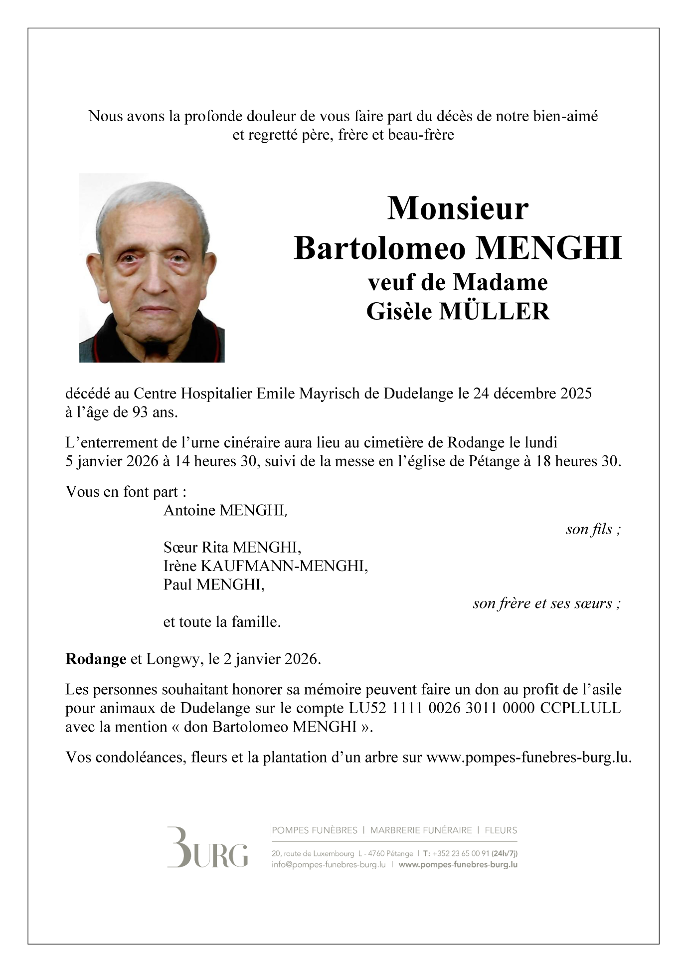 Décédé à Dudelange/Hopital  (3488, Luxembourg) le mercredi 24 décembre 2025 à l'âge de 92 ans