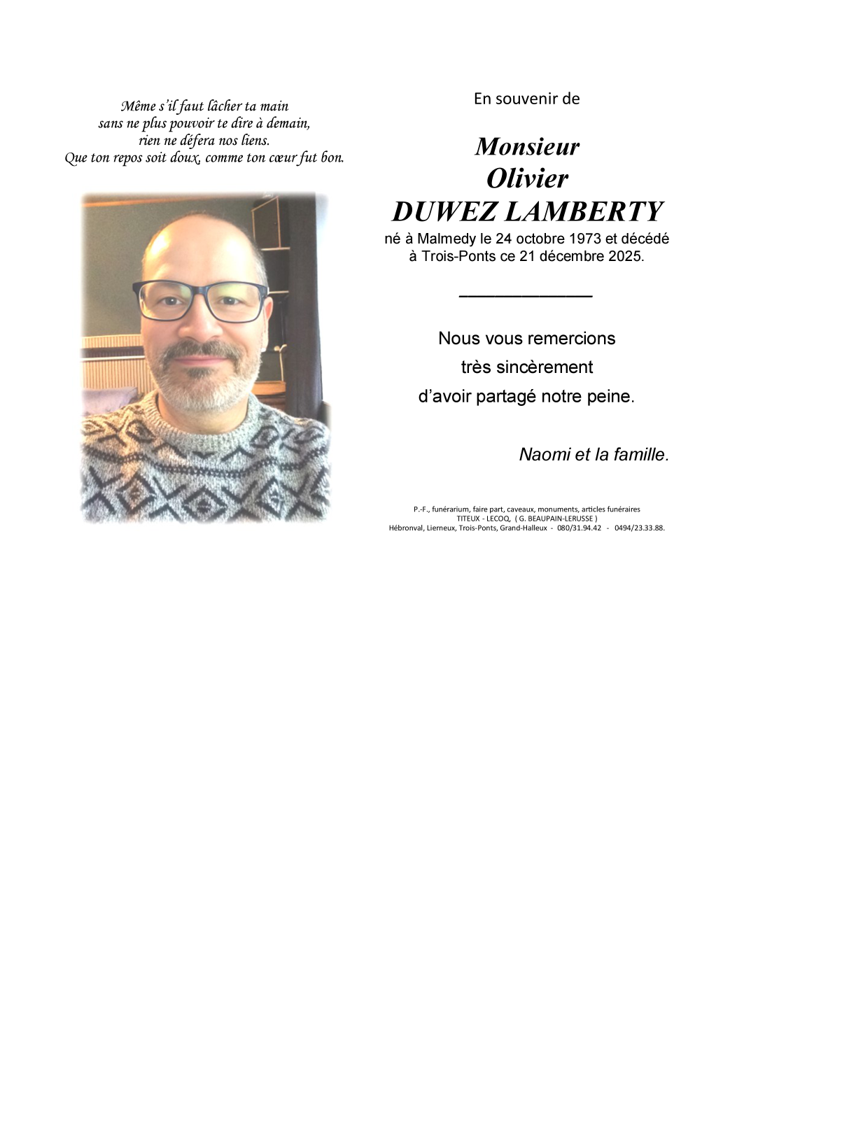 Décédé à Trois-Ponts (4980) le dimanche 21 décembre 2025 à l'âge de 52 ans