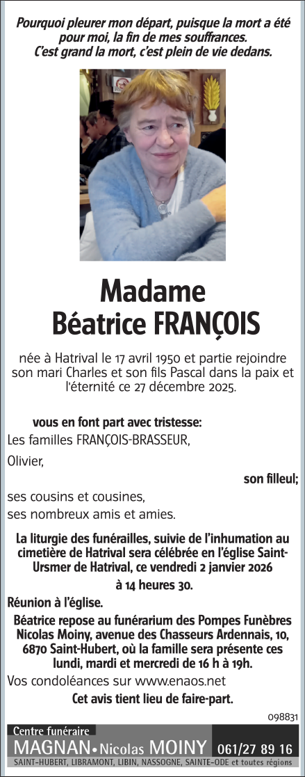 Décédée à Libin (6890) le samedi 27 décembre 2025 à l'âge de 75 ans