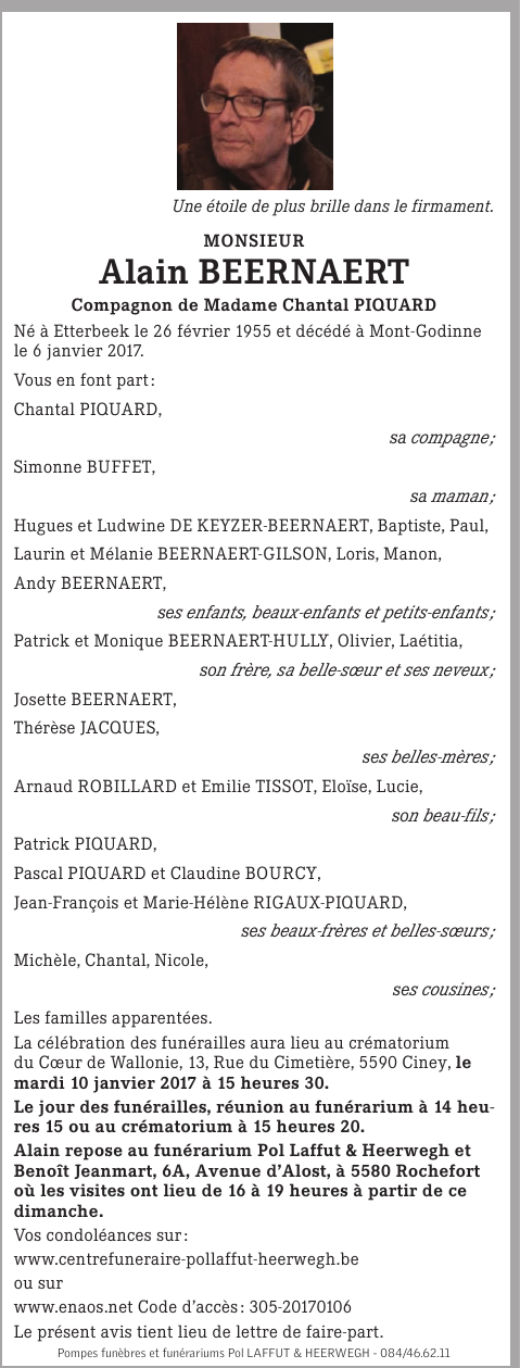 Fallecido en Mont-Godinne (5530) el viernes, 6 de enero de 2017 a la edad de 61 años